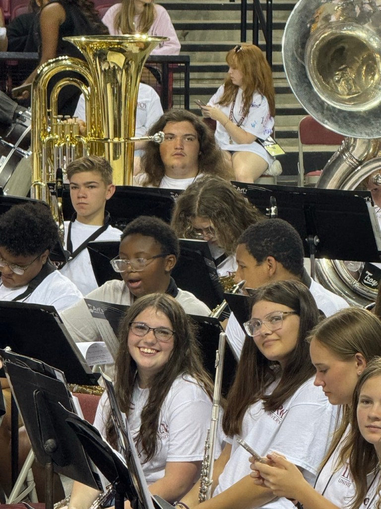 The camp was divided into six different groups: Drum Line, Majorettes, Dance Line, Color Guard, Drum Major, and Concert Band. Among our 14 participants, we had three drummers: Senior Christian Johnson, Freshman Waylon Whitfield, and 8th Grader Natalie Brown. Additionally, we had ten Concert Band members: Seniors- Fenix Morgan, Amiyah Rose, Wyatt Linton, and Emmons Crawley; Juniors- Jackson Cherry and Shylah Helms; Freshmen Juliana Nunery and Spencer Tucker; and 8th Graders- Myleigh Pitts and Joseph Whitfield. We also brought our 2025-26 Drum Major, Junior Karsen Bevans.